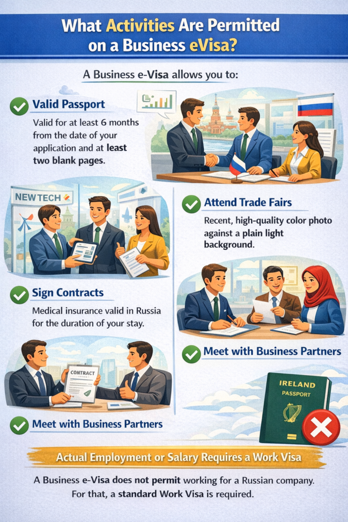 A Business e-Visa allows you to participate in negotiations, attend trade fairs, sign contracts, and meet with business partners. However, it does not permit actual employment or receiving a salary from a Russian company. For that, a standard Work Visa is required.